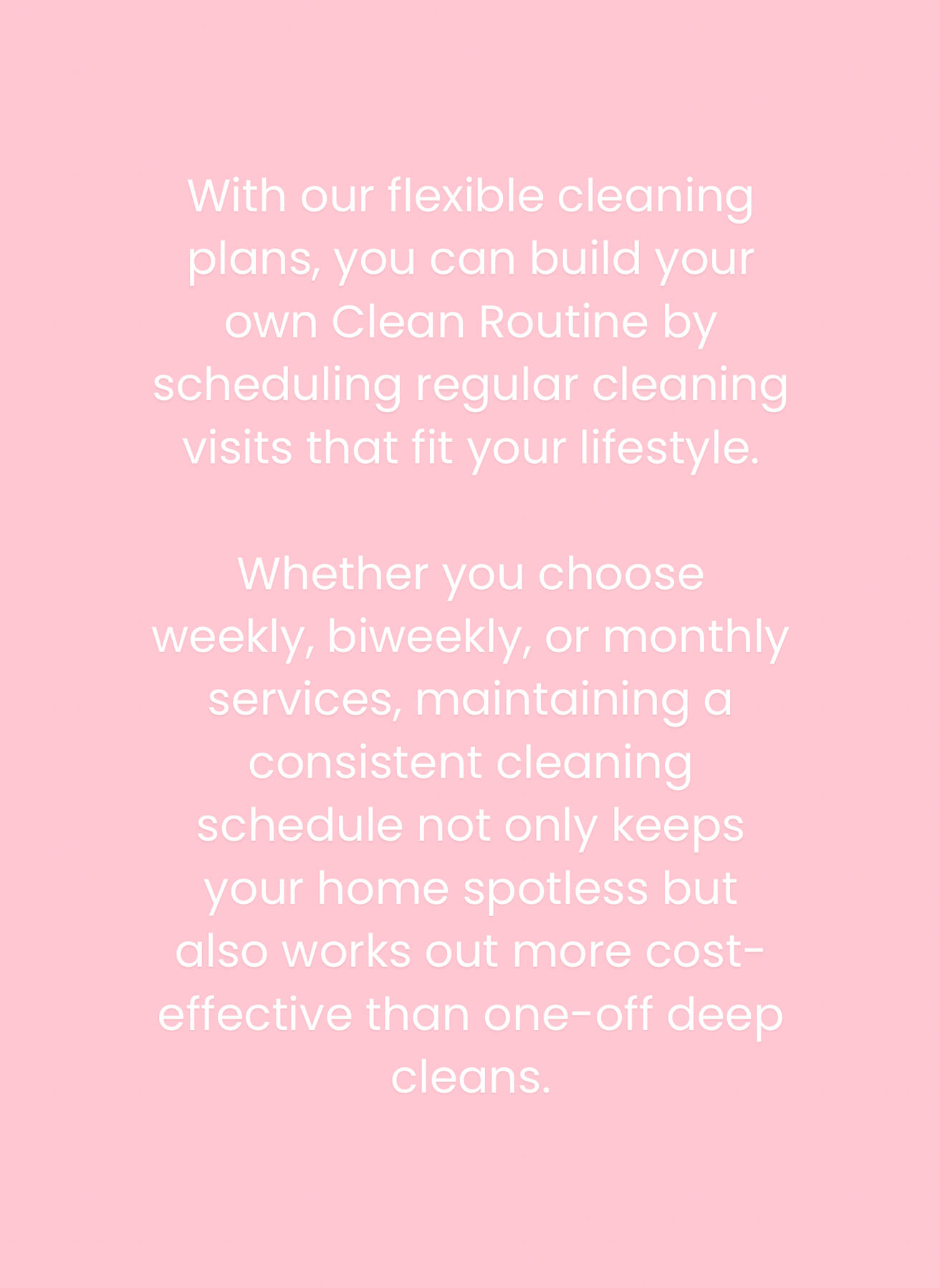 Our pricing is designed to be flexible and tailored to your needs.Whether you need a one-time deep clean or regular scheduled cleaning, we offer flexible flat-rate packages and ongoing cleaning plans to suit every household.You can also customise your booking with add-ons for more in-depth services to ensure your home gets the attention it deserves.Get in touch today to find the perfect cleaning plan for you!